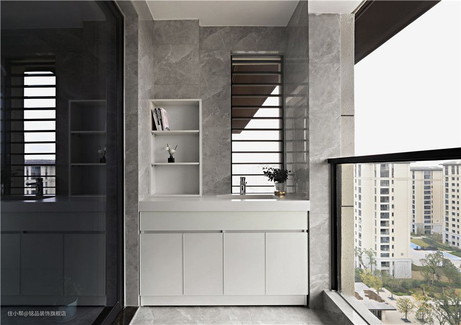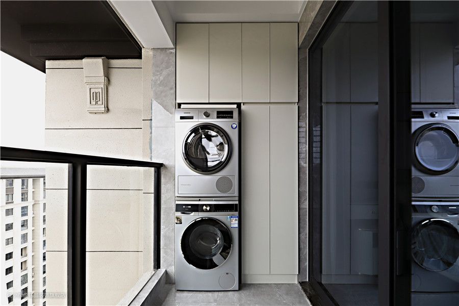 因为物业不允许阳台封闭,不过好在不影响对这个空间的使用。定制阳台柜解决了阳台的收纳问题,洗衣机烘干机叠放式收纳很好节省的空间面积。定制无把手阳台柜在视觉上特别清爽舒适,可以收纳家里的大部分家具电器~