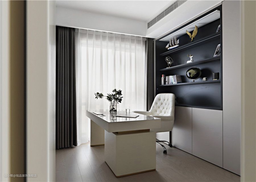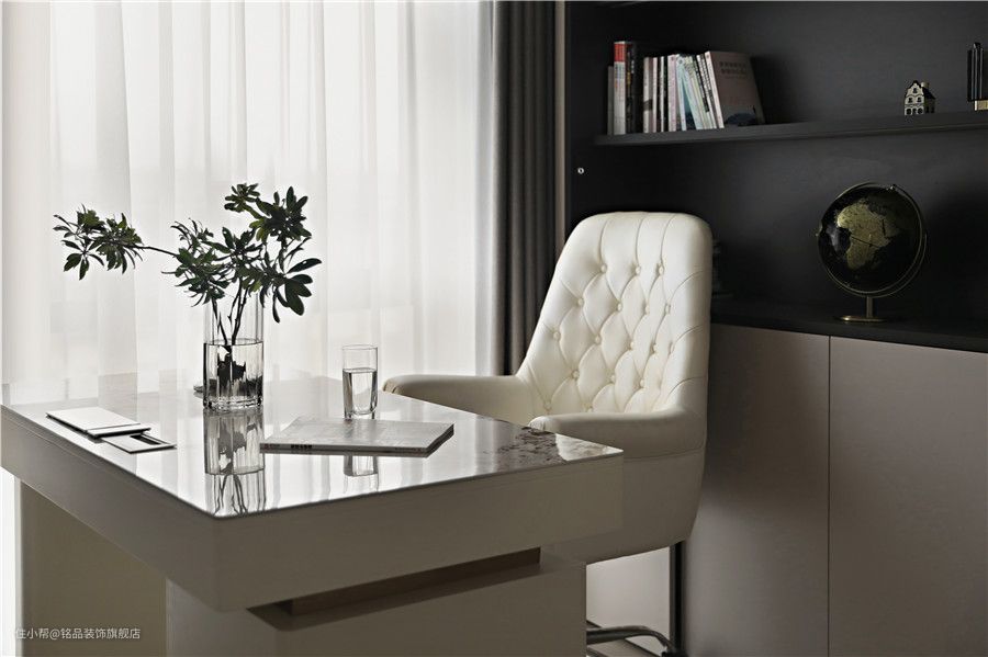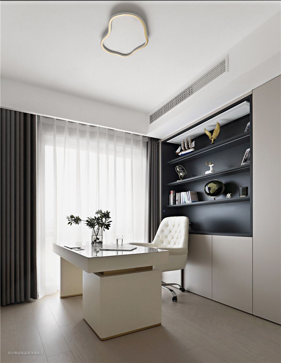 小书房也是现在多数家庭都不能缺少的部分,墙面定制柜体解决书房收纳问题。可移动的书桌椅给以后房间改造留下了足够空间