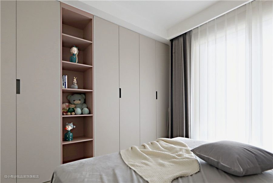 次卧装修留作长辈房或客卧,设计也是偏向简约舒适为主,单侧床头灯设计因为有金属元素的衬托,让卧室整体感更强!整扇落地窗引进了大量自然光源,卧室内拥有充沛的采光 次卧室床尾墙面完美利用起来,定制了整墙的柜体,开放格区可用来做摆件收纳台,满足室内美观性。其它柜体也能够重分实现一年四季的衣物收纳需求