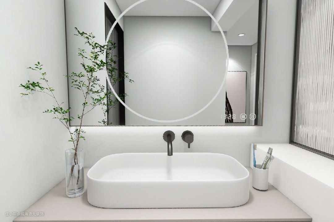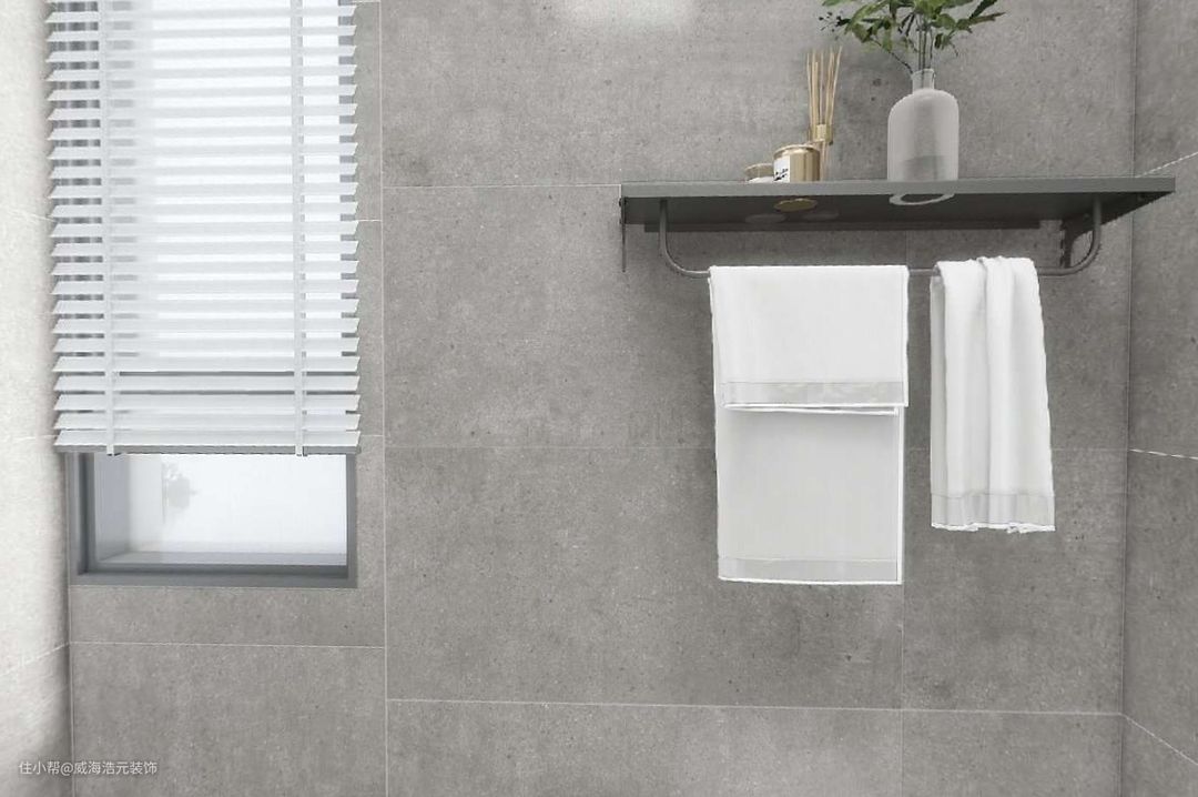 卫生间选用深色瓷砖,上墙不仅大气上档次,不会显得冷冰冰,而且耐脏耐看!白色哑光岩板台面,浴室柜是深灰色,与整个空间相呼应。