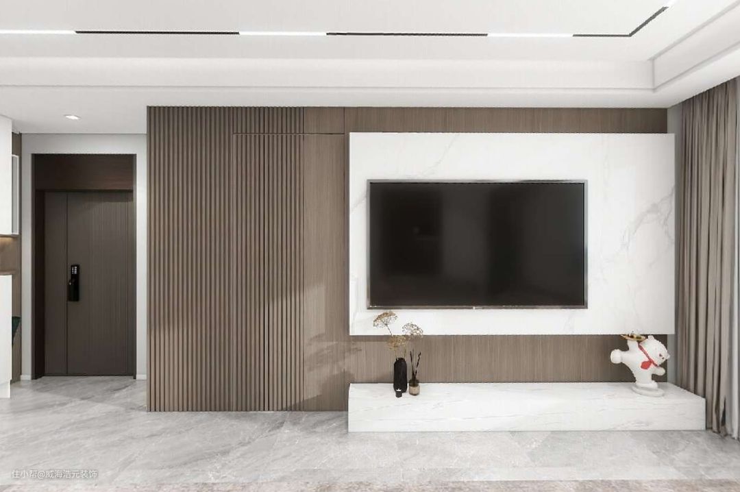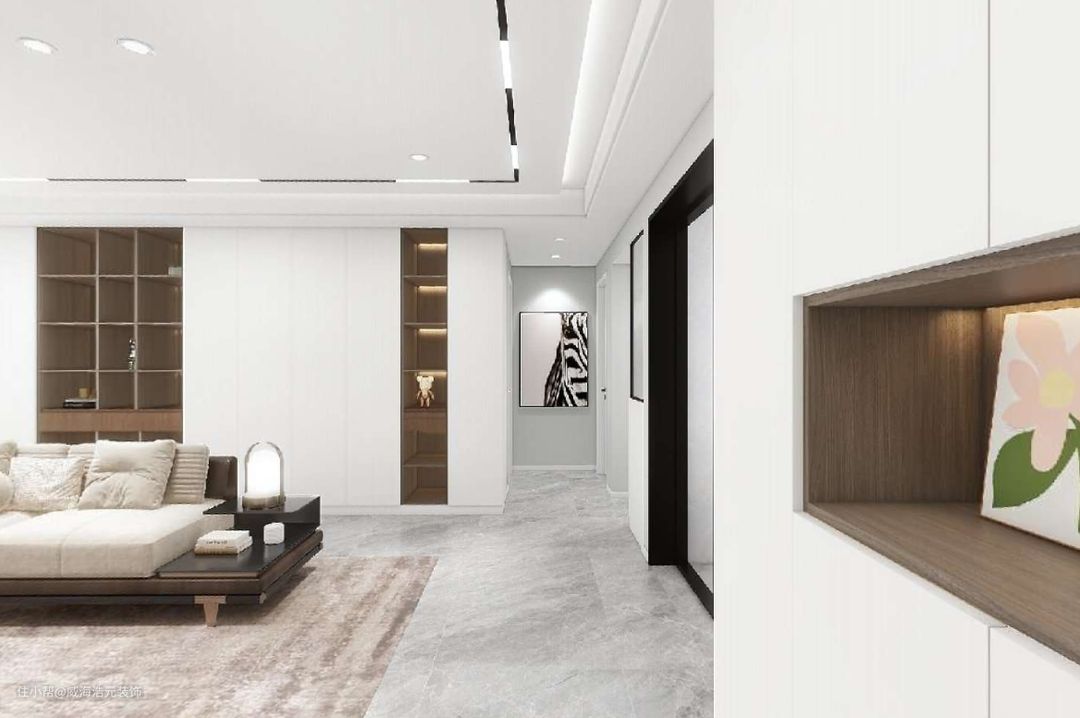 客厅满铺地砖,更显空间大气,电视墙使用石材为主导,两侧隐形门处用木饰面衔接处理,使电视墙加大纵向空间延伸感,整体空间更加开阔统一。书柜与木饰面的结合,突出高级质,悬浮吊顶+嵌入式磁吸轨道灯,彰显空间大气!