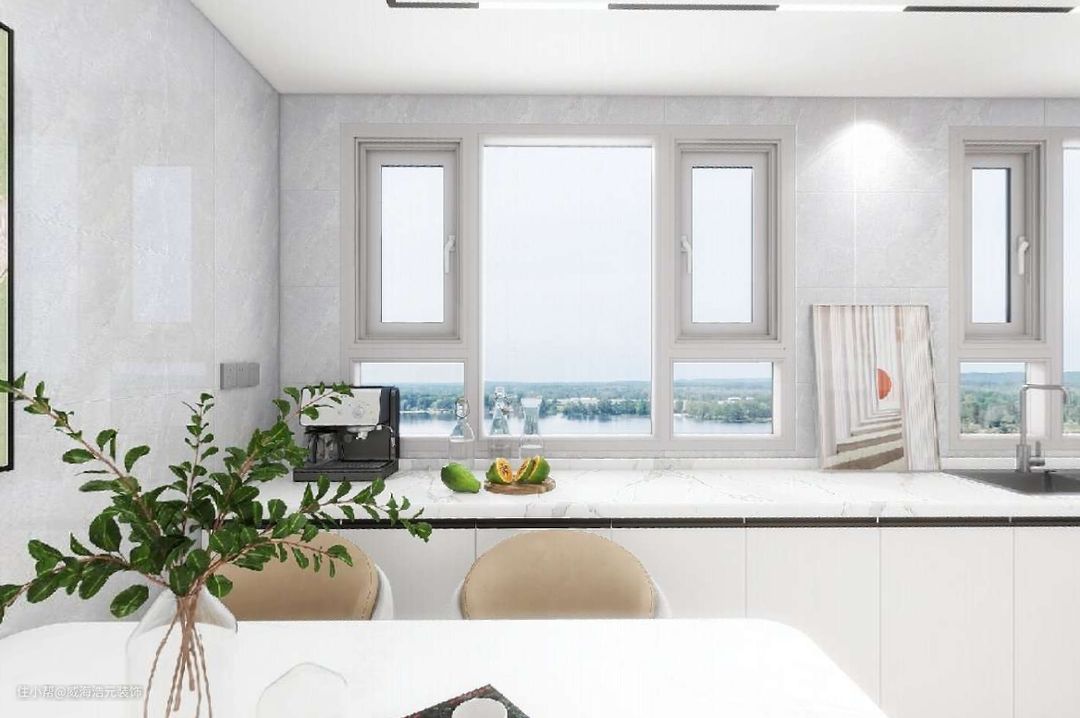 厨房与旁边的储物间打通,做餐厨一体设计,满足一家人的做饭需求,瓷砖通铺+无主灯设计,动线宽裕、空间敞阔透亮,不显大都很难!