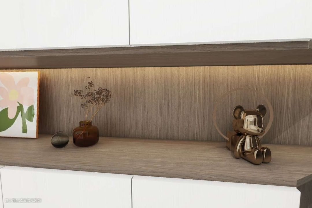 入户鞋柜左边作为换衣区,右边做切角的入户鞋柜,颜值和使用性都很ok~中间做开放格,可以用来放口罩、挂雨伞等等,加上感应灯带回家仪式感满满~