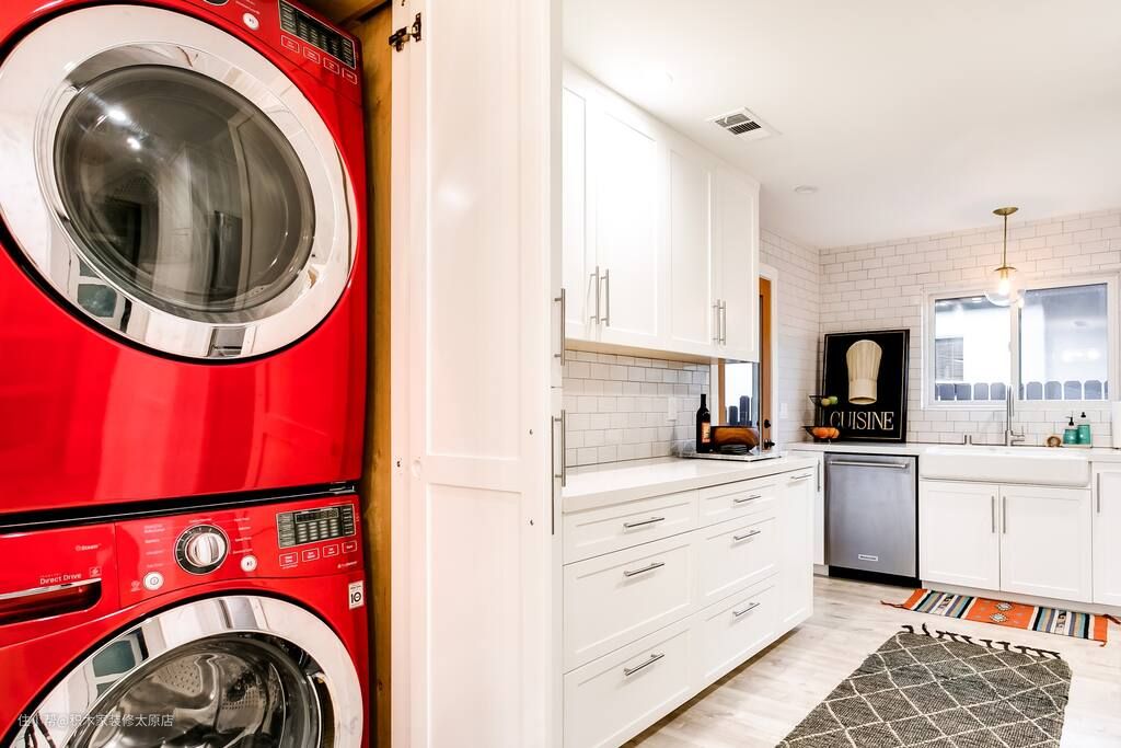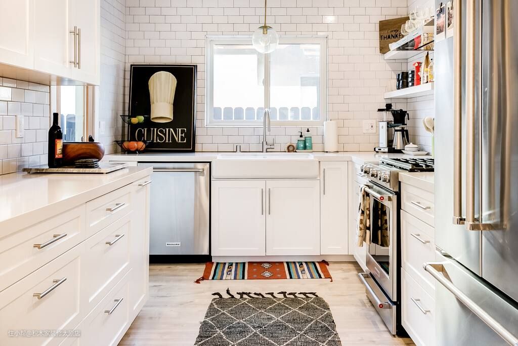 设计师拆除了厨房外侧的墙体隔断,为业主打造了一个通透明亮的烹饪空间。厨房内部做U字型的布局,构建清晰流畅的烹饪动线,提升了业主的使用体验感。奶白色的橱柜满足了厨房的收纳需求,不同尺寸的抽屉便于业主分类收纳餐具和厨具。操作台面选择了大理石的材质,便于业主清理水渍和油污。为避免滋生细菌,设计师将水槽设计在了通风和采光良好的窗户前。