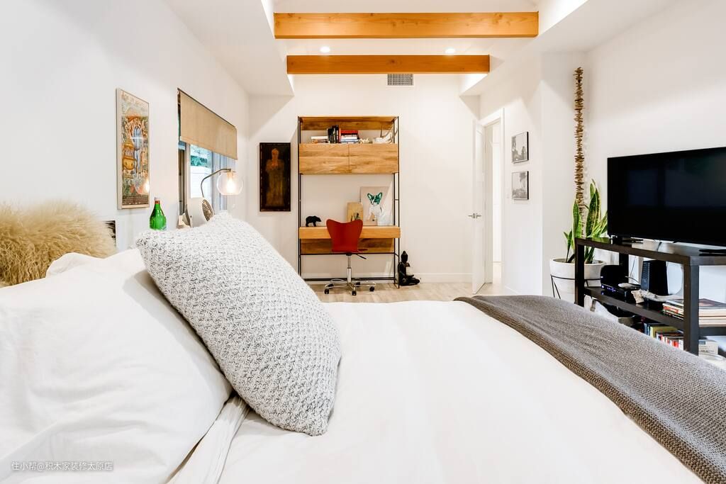 主卧通透明亮,层次感十足的吊顶搭配推拉式的玻璃窗,整体空间采光和通风良好。设计师在床头一侧设计了床头柜,方便业主随手摆放物品。为了增强空间的娱乐性和收纳能力,设计师在床尾增添了具有收纳空间的电视柜,柜台上摆放电视满足业主休闲放松的需求。设计师在主卧进门处设计了实木的电脑桌椅,满足了业主在家办公的需求。