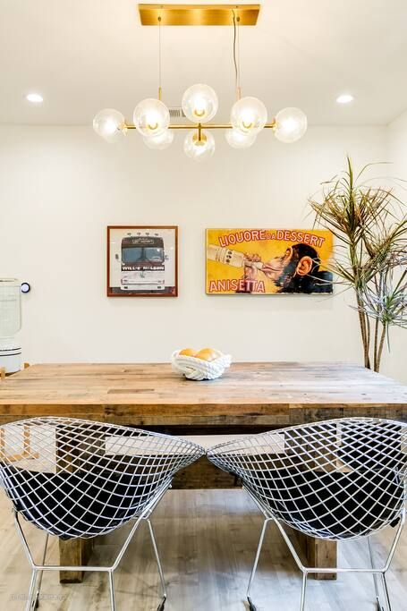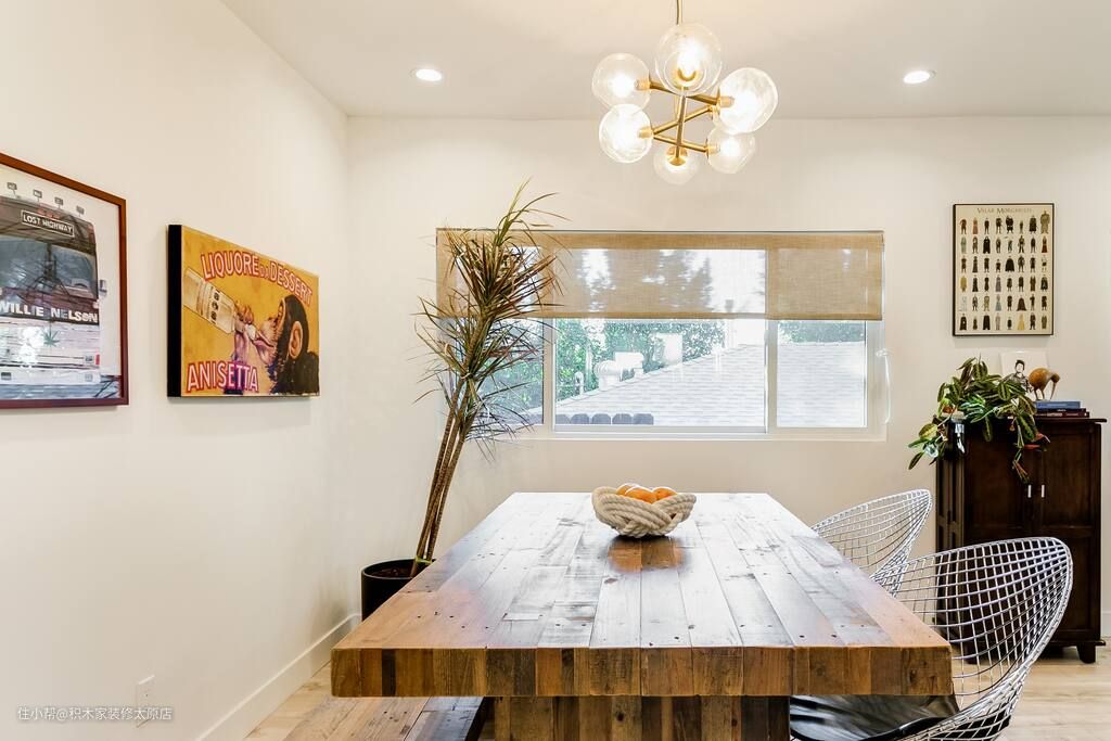 设计师利用客餐厅一体化的设计思路,将餐厅设计在客厅另一端,为业主打造了一个宽敞舒适的就餐区。就餐区选择了一张厚重的实木餐桌,搭配两把轻盈简约的餐椅满足了业主的日常就餐需求。餐椅做了镂空设计,让空间多了几分呼吸感。餐厅上方设计了时尚美观的吊灯,既增强了空间的视觉吸引力,又为业主营造出温馨浪漫的氛围感。设计师在餐厅一侧设计了收纳柜,增强了空间的收纳能力。