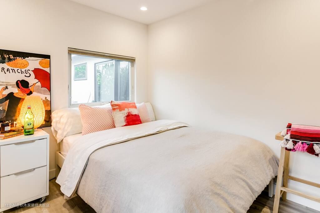 次卧温馨舒适,中性灰色的床品搭配暖色调的抱枕,整体空间清新美好。床头的玻璃窗为室内引入了充足的采光,平吊顶+筒灯的设计让空间通透又大气。床头一侧设计双层抽屉的床头柜,增强了空间的收纳能力。床尾设计置物凳,方便业主摆放床幔等物品。