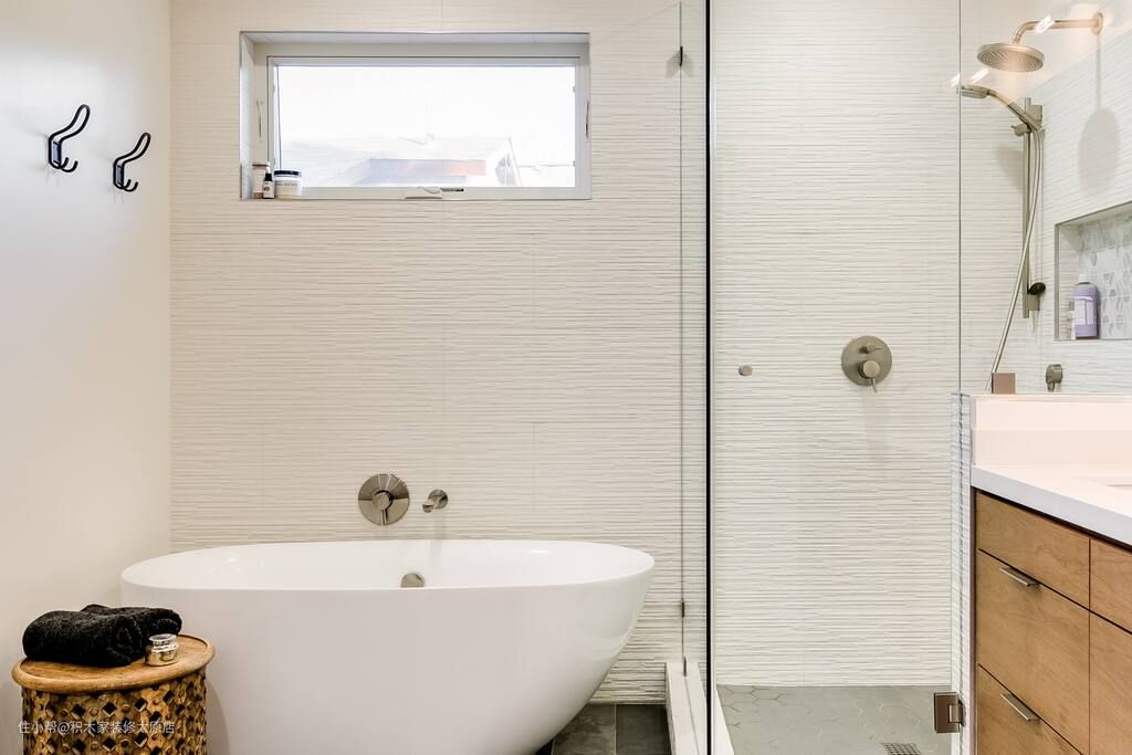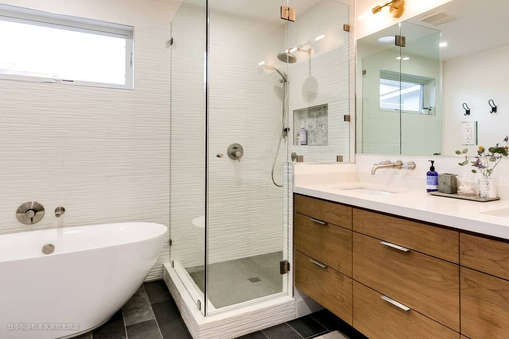 卫生间满足了业主的个性化需求,既做了干湿分离又设计了站立淋浴区和浴缸,功能性与美观性兼具。站立淋浴区内部墙面上做壁龛,用于摆放洗浴用品。浴缸一侧设计衣物篓,便于业主摆放浴巾和衣物。盥洗区墙面上设计玻璃镜,下方设计壁挂式浴室柜,既可以用来收纳卫生用品,又可以满足业主的洗漱需求。