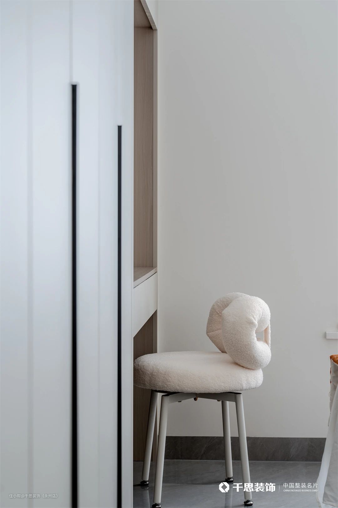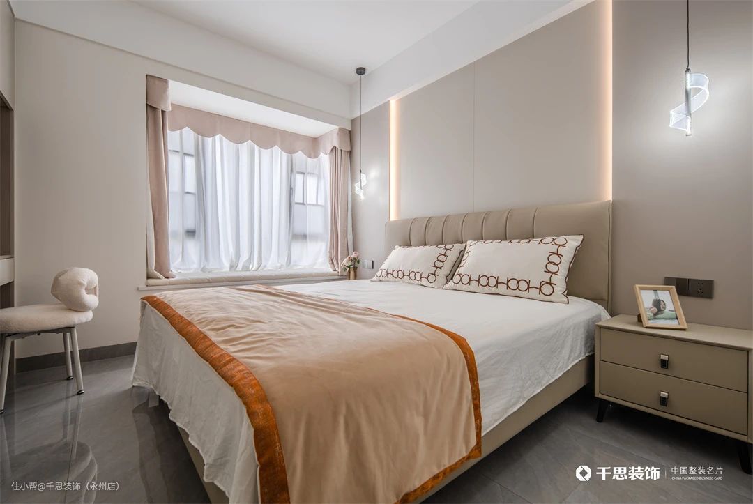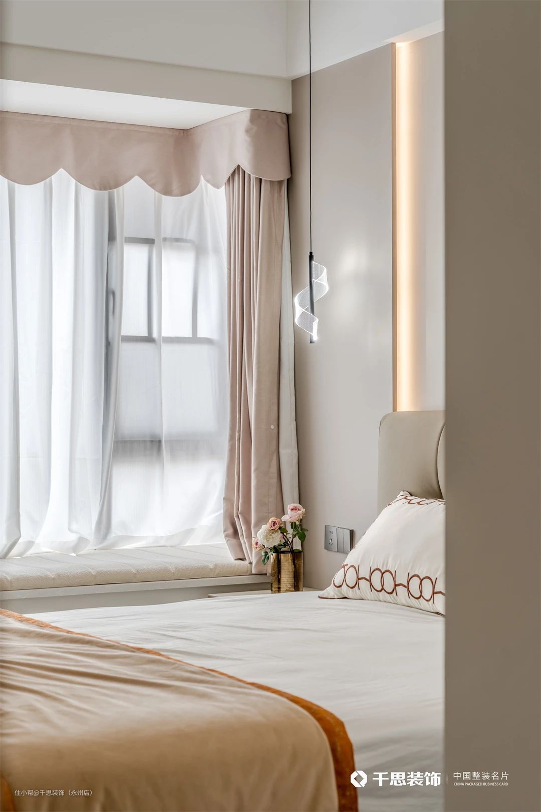 ▲ 主卧,整体实用浅色调,加以暖黄色点缀,营造舒适温馨的睡眠氛围。保留了飘窗一遇,加铺软糯的白色软垫,打造卧室休闲区。
