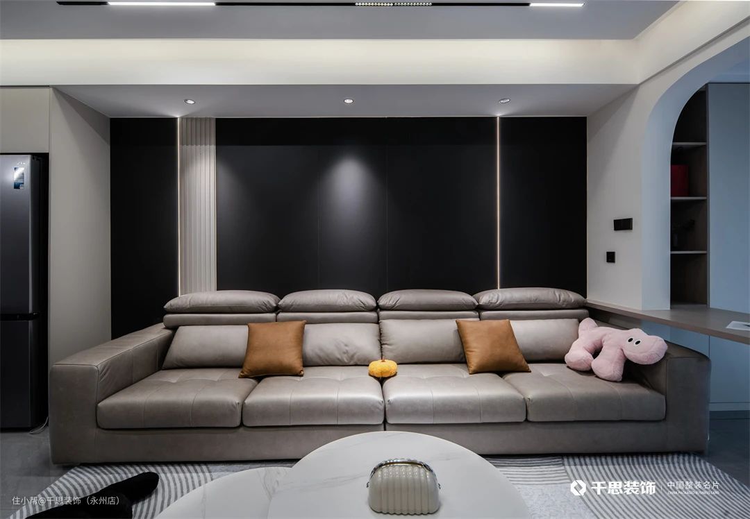 ▲ 客厅纳入阳台扩大使用面积与采光,拱形门设计柔和空间棱角。灰色哑光砖一路通铺,结合简洁大气的无主灯布局,极具高级感。挑选大气优雅的高级灰沙发,与黑色板材构成的背景墙相辅相成,带来丰富的层次效果。辅以橙色抱枕、粉色玩偶点缀,调和清冷感。