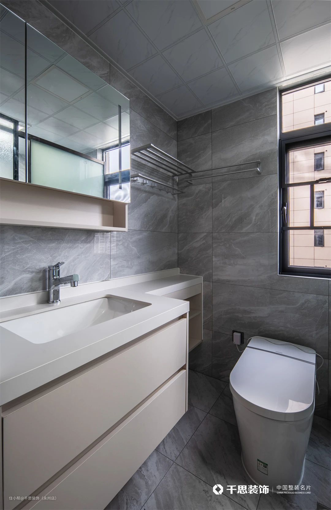 ▲ 客卫,将干区外移,洗手台右侧叠放纳入洗衣机与烘干机,实现空间的多种功能。主卫墙体一体设计,功能齐全,简洁的陈设落落大方。