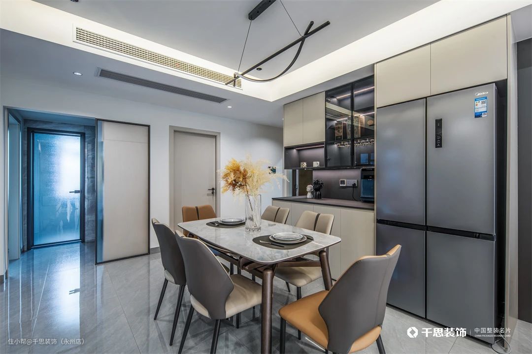 ▲ 沿墙打造整排餐边柜,柜体颜色材质与电视墙呼应,于左侧预留部分空间方便将冰箱内嵌,为厨房减压,多功能的设计满足更多需求。
