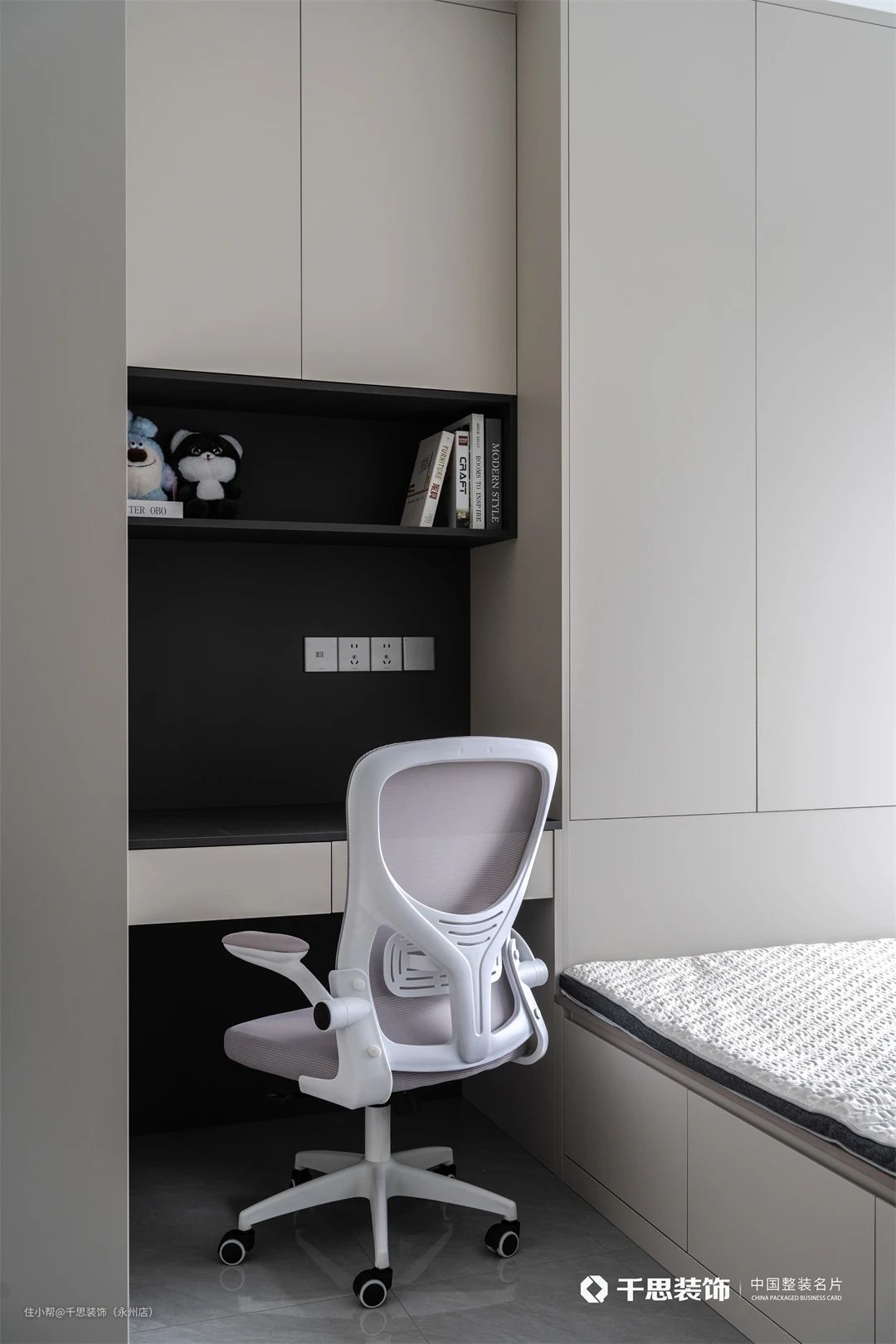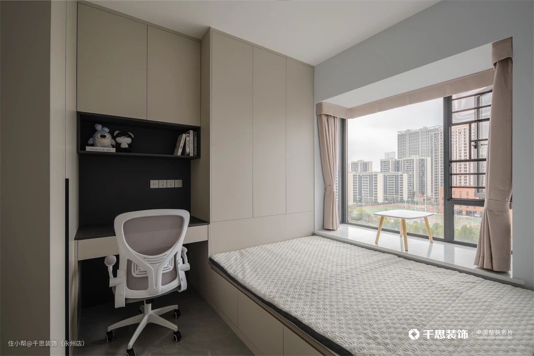 ▲ 儿童房延续整屋格调,简约舒适。沿窗定制榻榻米,与飘窗严丝合缝,为规划学习区预留足够空间。低饱和配色营造干净清爽的氛围。