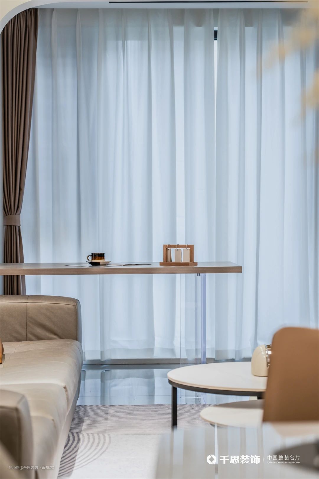 ▲ 沙发右侧从墙体延伸出悬浮长桌,连接阳台与客厅两个空间,可作边几置物,也可作为茶桌,根据需求灵活调整,赋予空间更多可能。定制黑玻展示柜与电视墙结合,一柜到顶设计,保证空间连贯与统一。封闭柜门+开放格的组合,将插座与电线完美隐藏,视觉更完整。