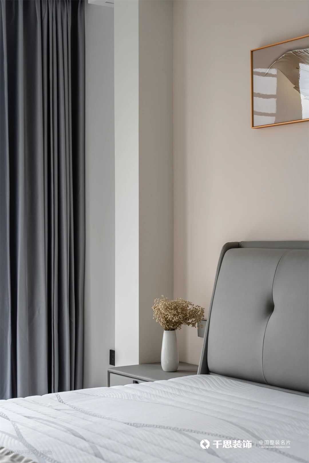 ▲ 灰色高背床头与床头柜保持统一色系于材质。挑选清冷中性调的床品、窗帘,辅以干净利落的线条修饰,构建舒适静谧的适眠空间。