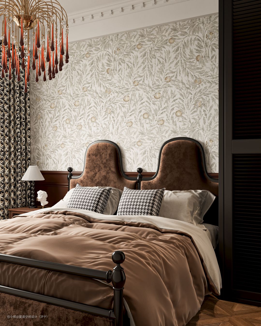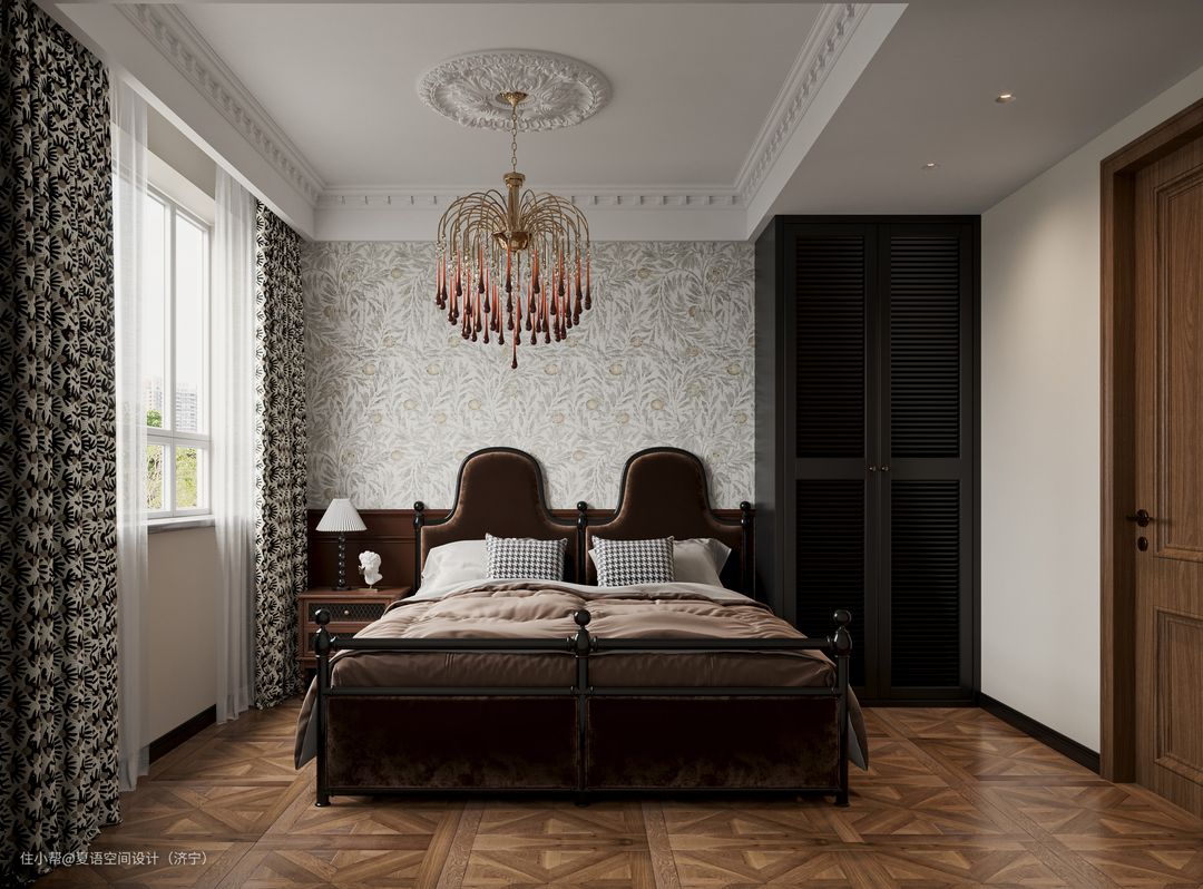 次卧以深色系为主,吊灯选用时下流行的鼻涕灯搭配小碎花的壁纸,如此细节也凸显我们的设计总监细腻的生活感受和对浪漫复古风的理解。
