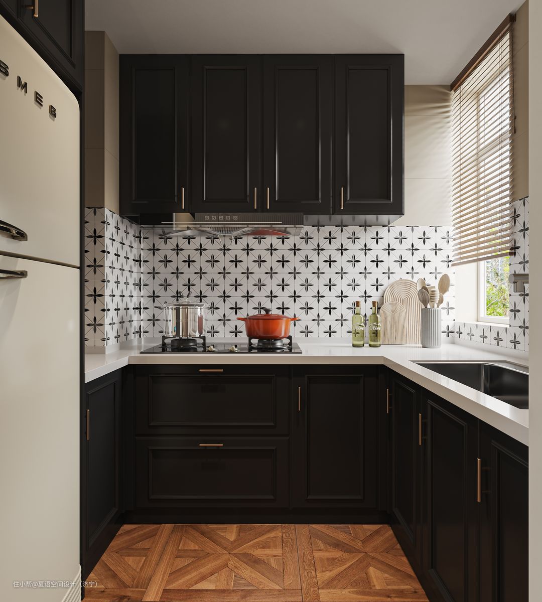整体厨房地柜吊柜与墙砖黑白分明,黑色让整个居住空间更厚重,白色墙砖方便后期打理。