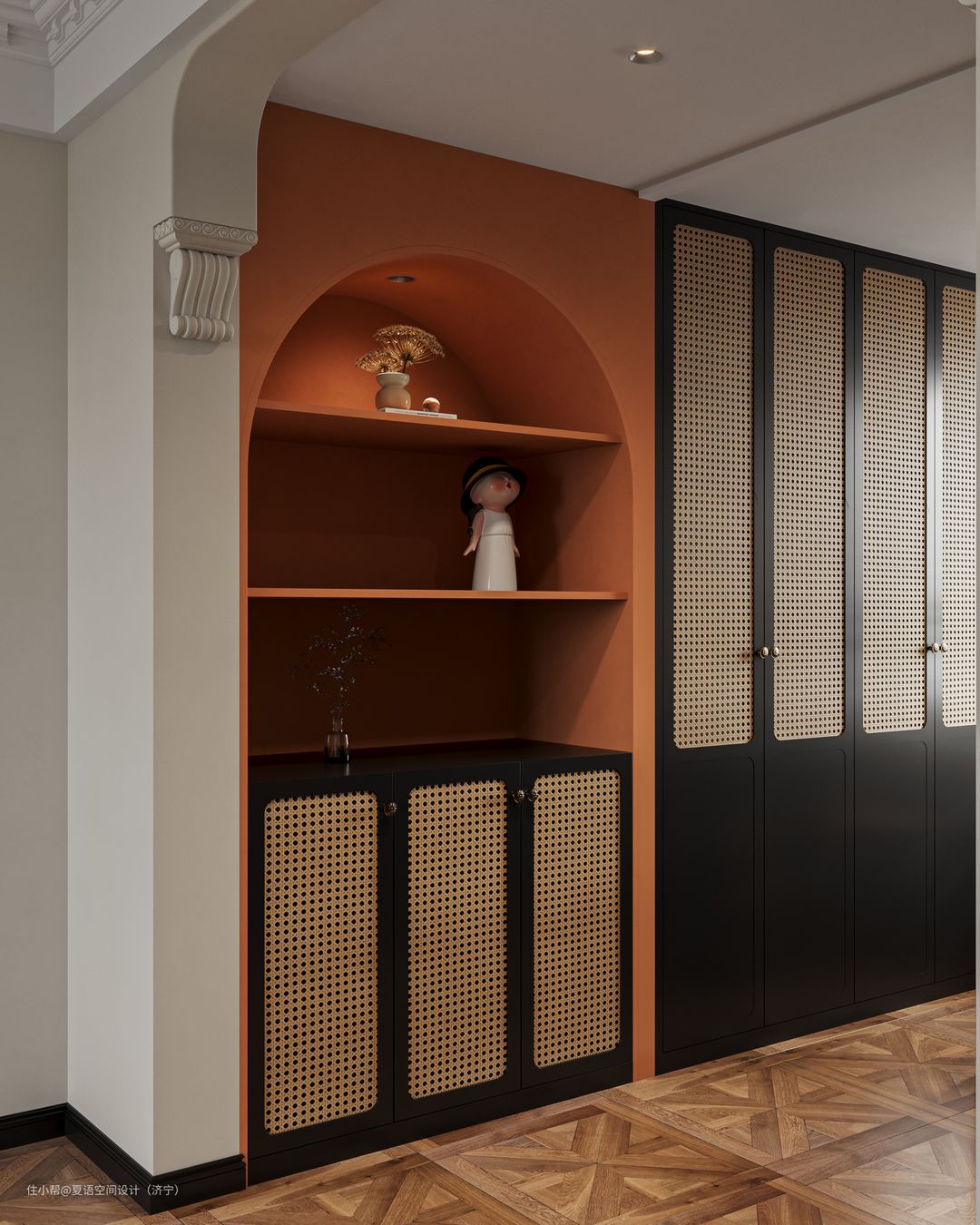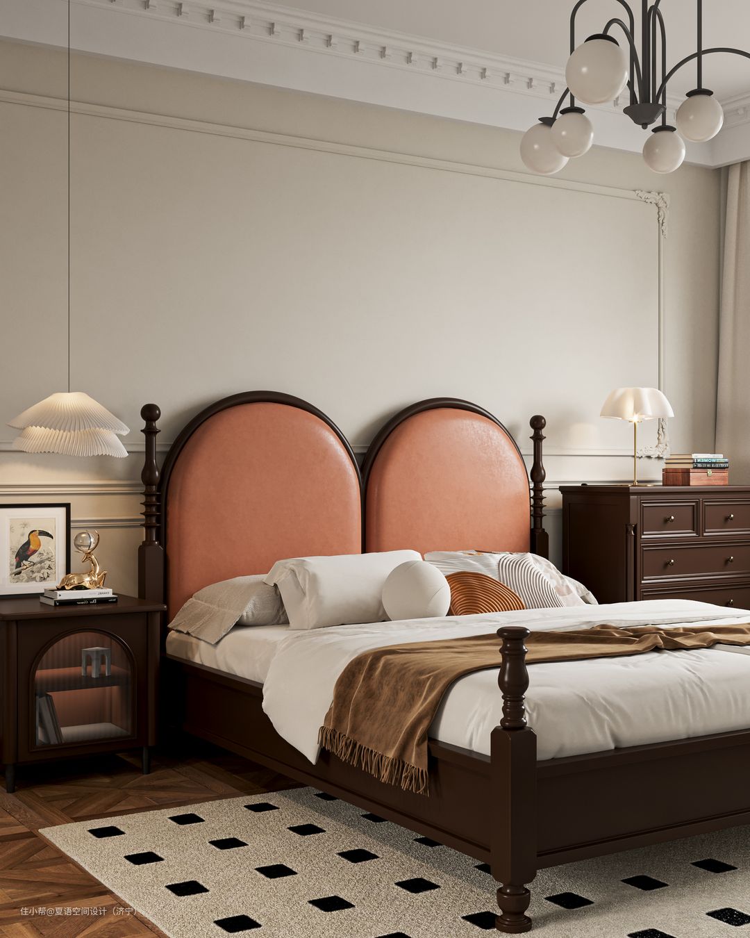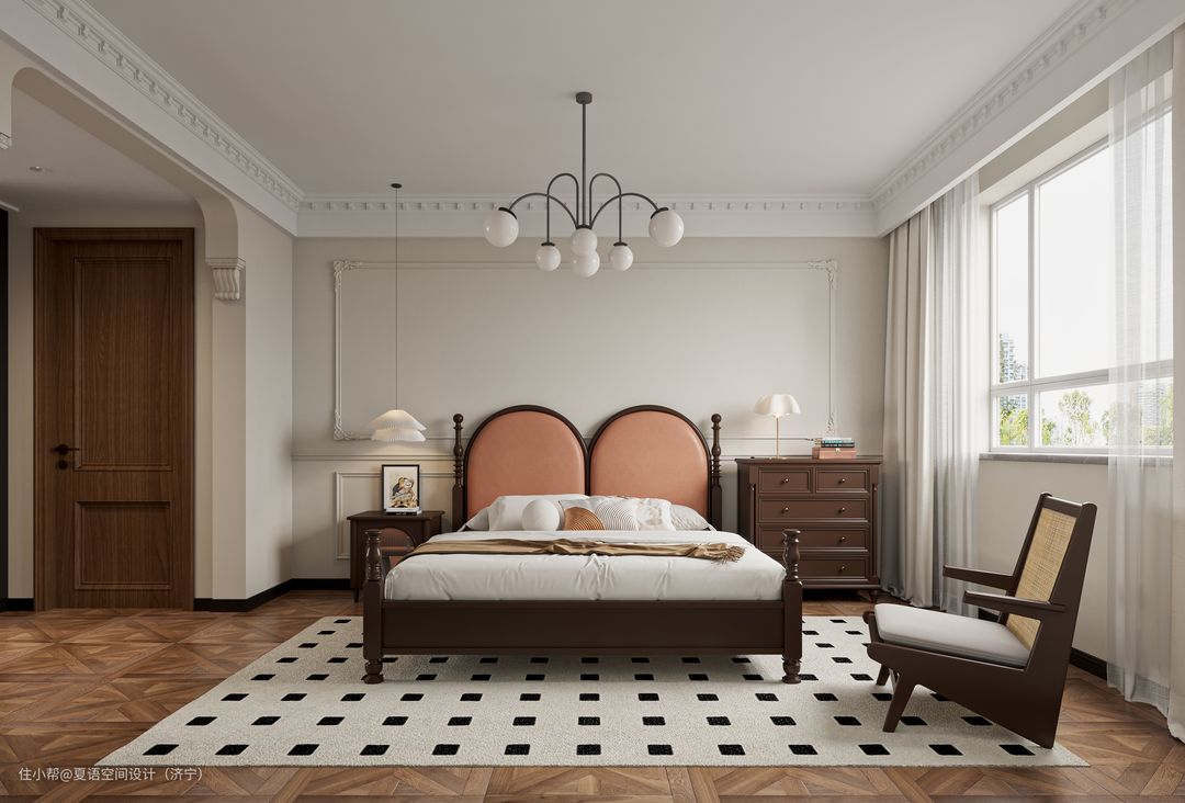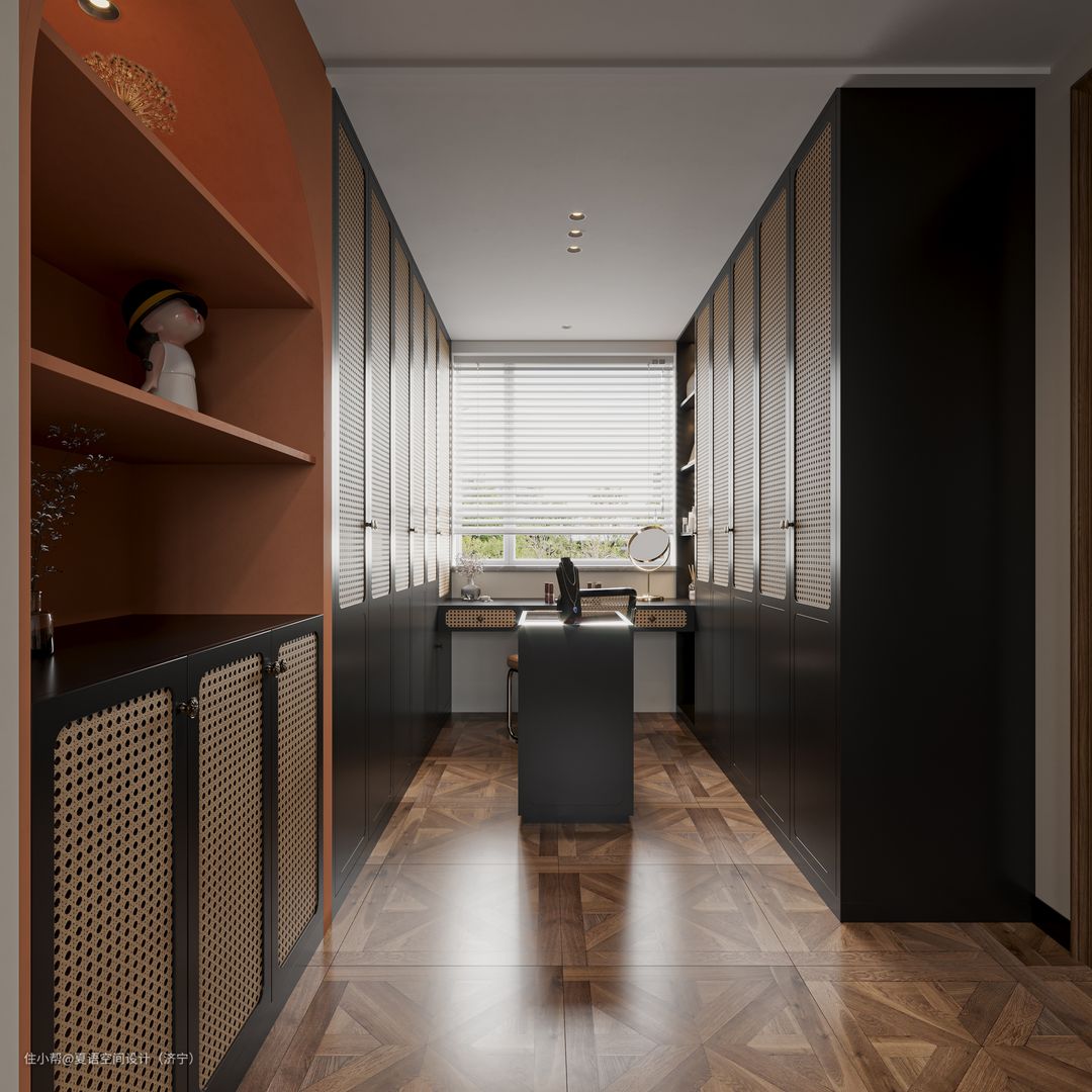 主卧采用复古造型的双人大床,主卧空间以浅色系为主色调,与主卧相连的衣帽间则以黑色为主色调,搭配藤编柜门让整个空间更精致更具设计感。