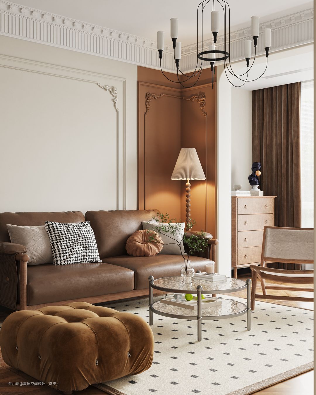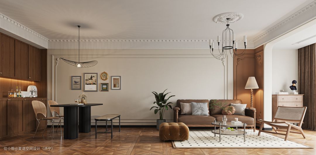 复古地砖搭配石膏线简约不简单,焦糖色的墙漆与皮质沙发的完美结合,壁炉造型让整个空间更具浪漫生活气息。