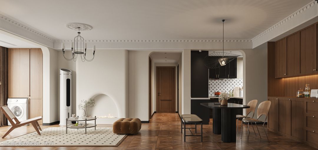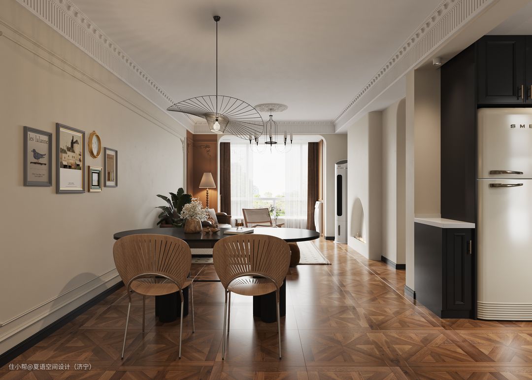 餐厅小巧精致,与客厅浑然一体交相呼应,吊灯与餐桌椅的选择复古风十足。