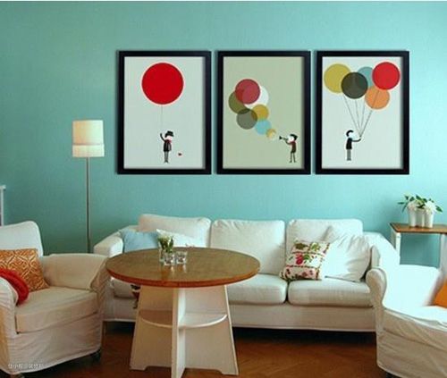 想要营造可爱温暖系的客厅的话,在选择背景墙挂画的时候就可以选卡通一点的图案,像上图这样的三张成组照片就很可爱,黑白的小人人和彩色的气球颜色多变,造型风趣。