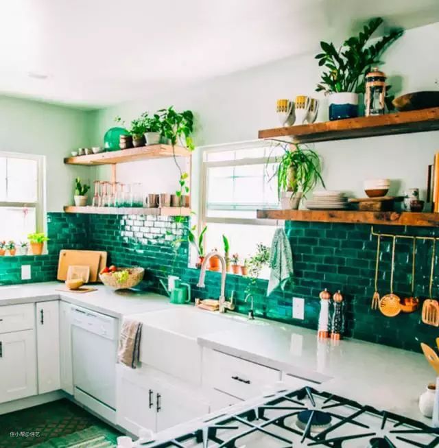 这是一位洛杉矶艺术家的厨房,绿色瓷砖成了置物架和窗台上陈列的茂盛盆栽植物的完美背景,和谐而清新。