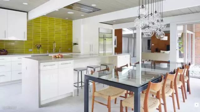 在这一翻修的Eichlers①厨房和餐厅区域,芥末黄的瓷砖贴面和藤条椅在白色主色调下更有种温暖人心的感觉。