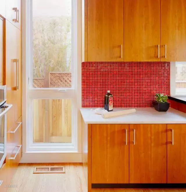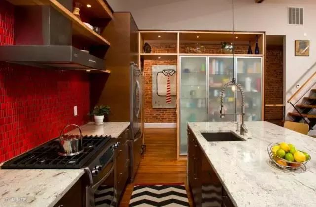 在这所加利福尼亚住宅中,使用了红色瓷砖的灶台防溅墙,它下面的白色大理石台面,在红色墙面的协调下,和整个厨房的色调更融合而不突兀。