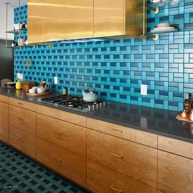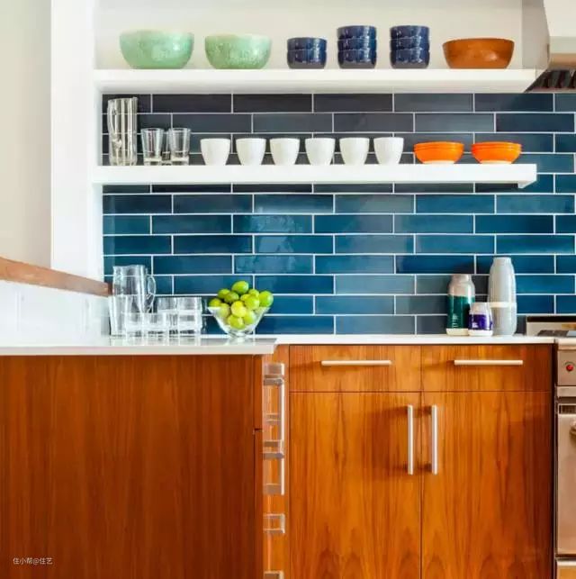 蓝色的瓷砖墙壁,成了大量彩色餐具和胡桃木的壁橱之间的完美过渡。不至于太明艳,但又充满生机。