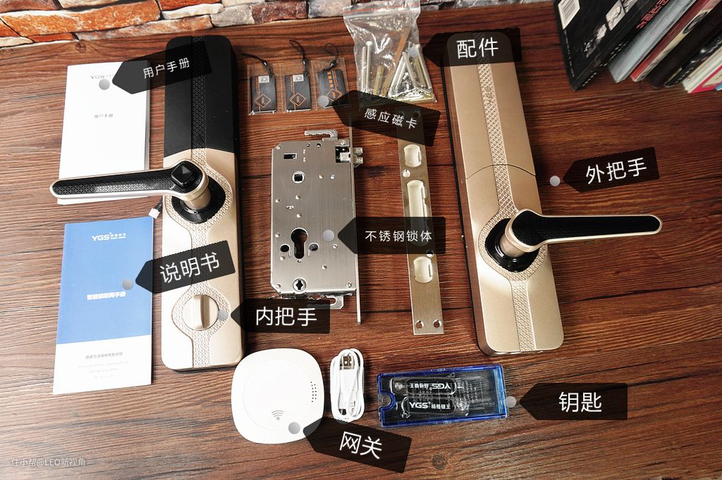 配件还是挺丰富的,内外锁总成、不锈钢304锁体、感应磁卡、网关、两把机械钥匙、说明书和螺丝方条等配件。比起一般的防盗门锁,要大一号,另外,内外把手的高度是不一致的,内部的把手在锁面板的正中间,而外部把手却相对靠下,对于有“强迫症”的对于这样的不对称设计可能会有点难受,当然还好是一个外,一个内,感受并不会过于明显。