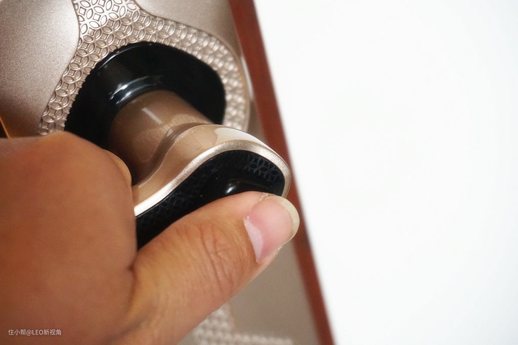 其实对于五金产品,LEO还是算半个专业人员,因为有过10年左右的于装饰五金产品打交道,其中就包括门锁,拉手之类的产品。锁体锁芯的安全性除外,前面提到过,一套门锁另外个重要的作用,就是装饰性了。那就是外观设计和表面处理了,贝塔7号可选颜色有香槟金、曜石黑河红古铜三种颜色,拿到手的是香槟金,表面平整,颜色均匀透亮,边角细节抛光都做的很精细,而特别难得是中间一条花纹,其实这样的设计对于脱模和抛光的要求会非常的高。仔细看花纹发现是铜钱造型,和把手上黑色部分的花纹一致,寓意吉祥。空载试了下把手,间隙非常的小,能明显感受到把手的回弹。
