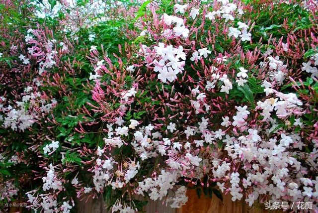 多花素馨,多年生缠绕藤本植物,如果有适当的攀爬架的话,它可以爬的很高,一年就可以长到2-3米长。它的花苞呈粉红色,开放之后的花朵会变成白色,花量超级大,可以从3月陆续开放到8月份,挂满枝头的花朵,如果地栽效果会更棒,栽种多花素馨的话,建议使用高挑敞口盆,选择用草炭土和园土按照3:1比例配制花土,平时一定要保证充足光照,大水大肥伺候即可,如果是小苗栽种的话,要适当对其进行摘心,以簇生更多的分枝。