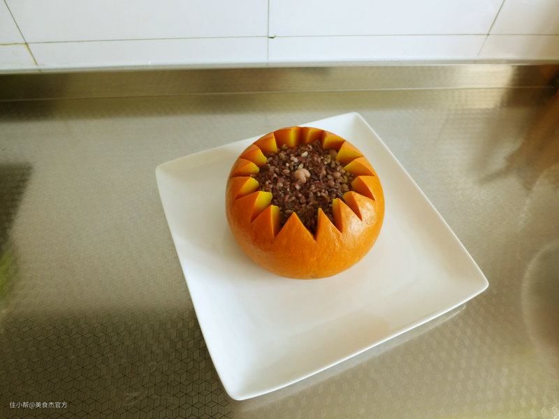 南瓜 1个、糯米 50克、紫糯米 50克、燕麦 20克、糙米 20克、香米 20克、莲子 15克、绿豆 15克、红豆 15克、薏米 15克、红芸豆 15克、芸豆(白) 15克、鲜枣 3个、红糖 适量