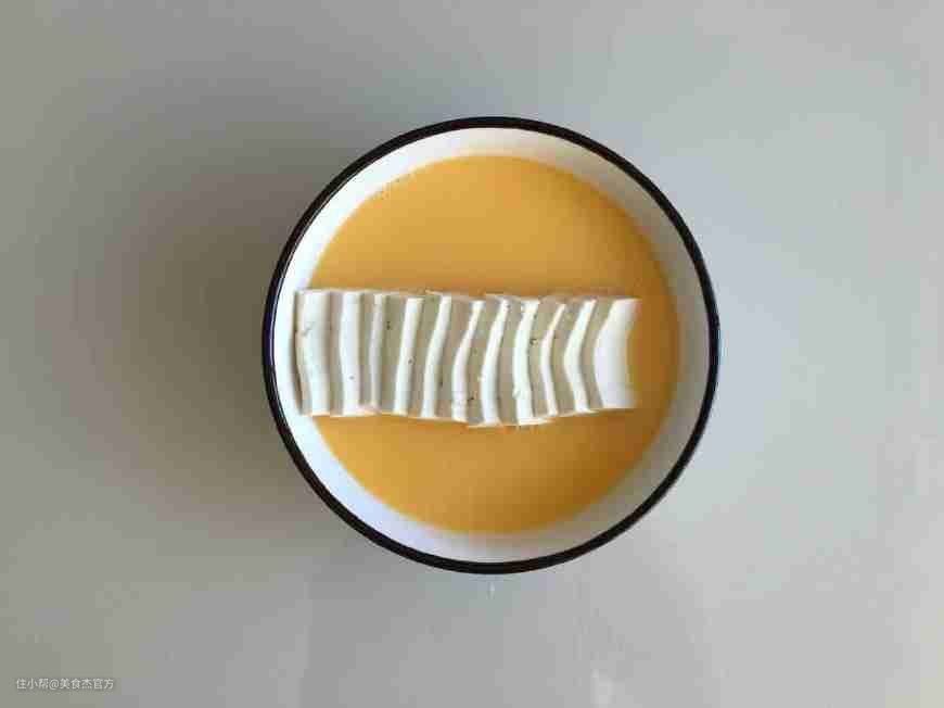 4.豆腐切片整齐排列放置在耐高温的碗中,倒入蛋液