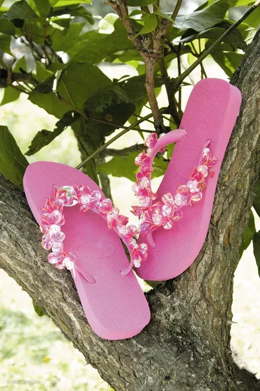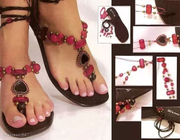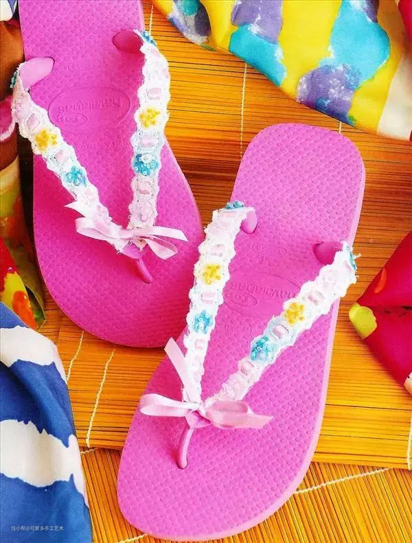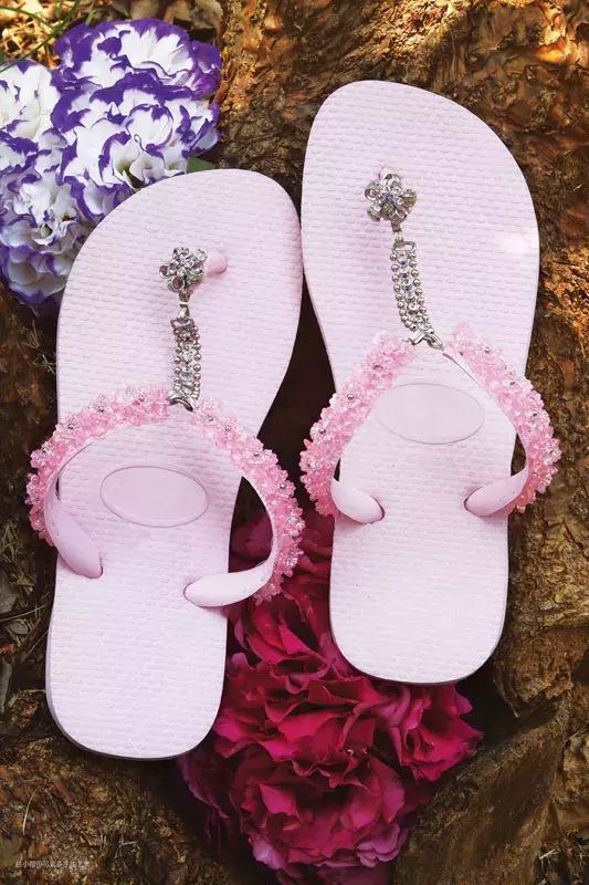 如果人字拖的人字塑料边,觉得比较low或比较旧的话,上面绕上布条或丝带,再缝上你喜欢的珠子,这样就更加奢华了。