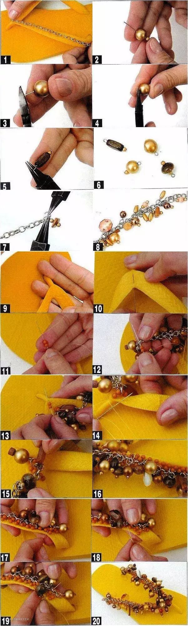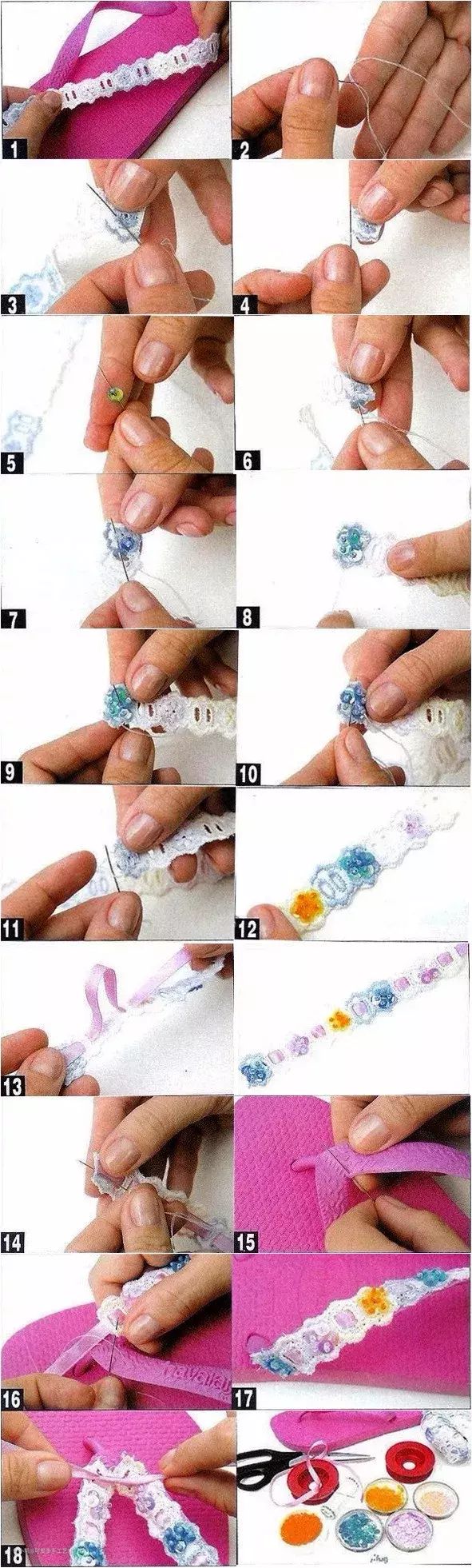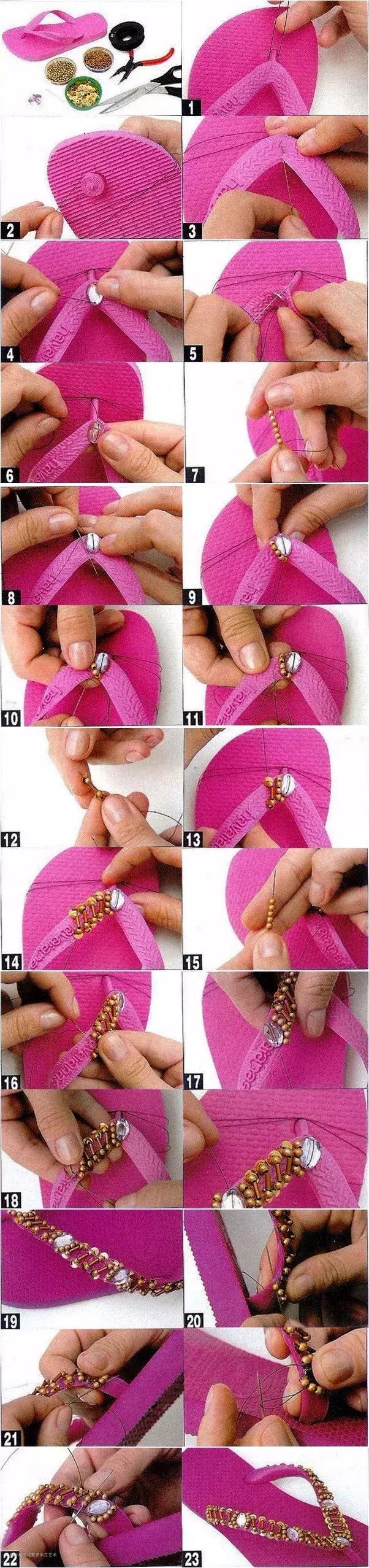 人字拖的改法有很多种,把串好的人字串珠造型,直接缝在人字拖的人字上即可。或珠饰不复杂的情况下,一颗颗缝在人字上,这样更牢固。而不喜欢只穿人字拖又想改个款式来穿的话,剪一剪或加一些材料进行连接,就能变成一双凉鞋啦!
