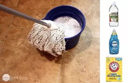 将 30ml 醋、20g 小苏打和 1L 水均匀混合,然后可加入少量洗洁精,然后用混合好的溶液擦洗地板,不仅能轻松除尘,还能有效祛除油污。