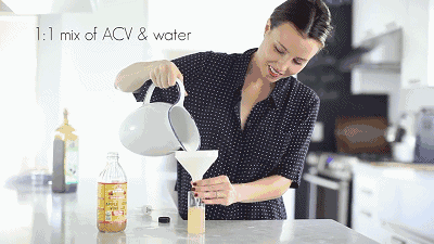 将1/4杯的苹果醋、2杯水和2勺橄榄油充分混合。