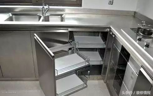 L型橱柜是比较常见的,但是设计不好的话,就会造成空间浪费,尤其是转角空间,可利用一些转角拉篮、小怪物等增加储物空间。在很多橱柜品牌中,比如欧派、金牌、欧睿宇邦,还有进口橱柜威乃达、takara、松下,德国柏丽等橱柜,都有各种款式的转角拉篮设计,可以说已经非常人性化了。