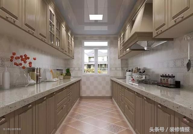 一般走廊、通道式厨房,适合设计成双线型橱柜,沿着两面平行墙建立工作和储物区,利用墙面空间,装双排连壁柜或连壁高柜,空间利用率高。设计时,洗、切、炒的操作区尽可能安放在一侧,减少操作距离。两排平行柜子之间也是120cm的间距,也可以一边柜子深度60cm,一边柜子深度35cm。这种橱柜设计在国内使用的读者比较少。
