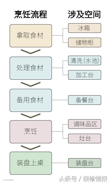 厨房操作三大项:洗、切、炒。构成了工作三角,如何配合衔接至关重要。工作三角分为烹饪区、清洗区和储藏区三大部分。根据功能的不同,又可分为 5 种功能分区。
