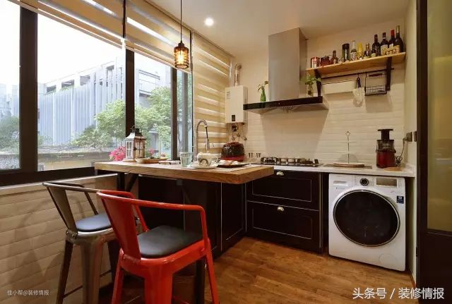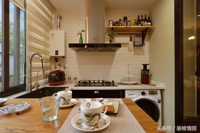 橱柜设计的时候特意为洗衣机留出了位置,这样就可直接在卫生间洗衣服、晾晒,非常方便。为了空间不那么拥挤,对于厨房收纳,设计师选择了简洁又实用的木板架,柴米油盐全部可以收纳,再加两个收纳篮,简单又实用。点击可查看完整案例:这么难找的物件都被设计师搬进了复古百年老洋房里!。