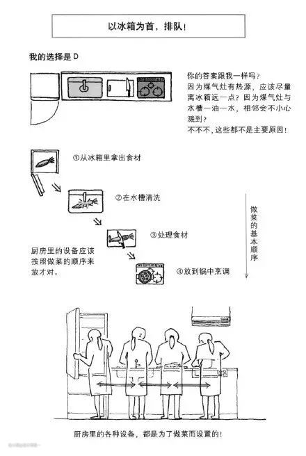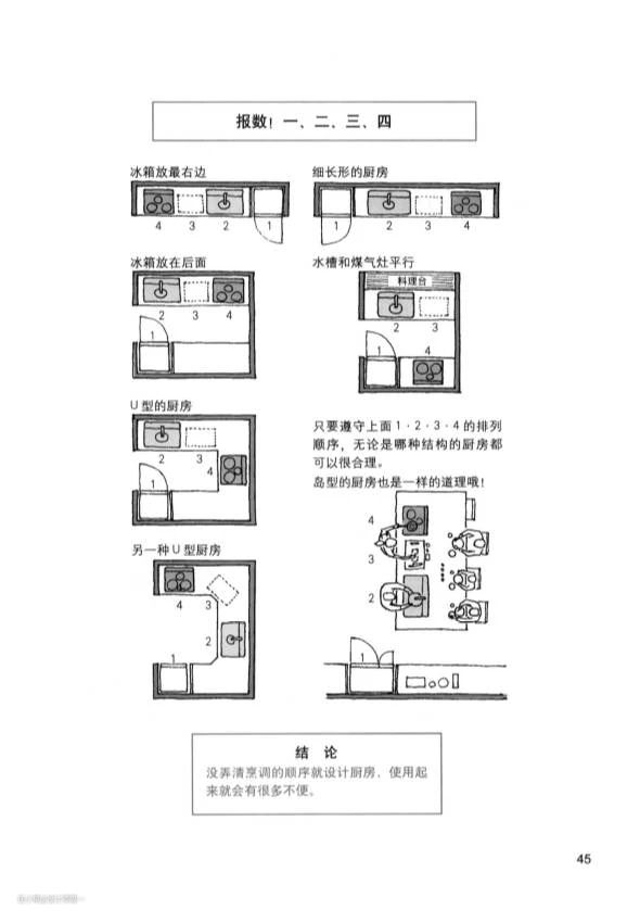 根据家里的实际情况(户型、面积、使用习惯)进行布局,但是最好要符合厨房的操作流程。在增田奏的《住宅设计解剖书》里写到,厨房里的设备应该按照做菜的顺序来放:①从冰箱里拿出食材——②在水槽清洗——③处理食材 ——④放到锅中烹调,只要遵守1234的排列顺序,无论是哪种结构的厨房都适用。如果没有弄清楚烹饪的顺序,在后期使用过程中就会有很多不便。
