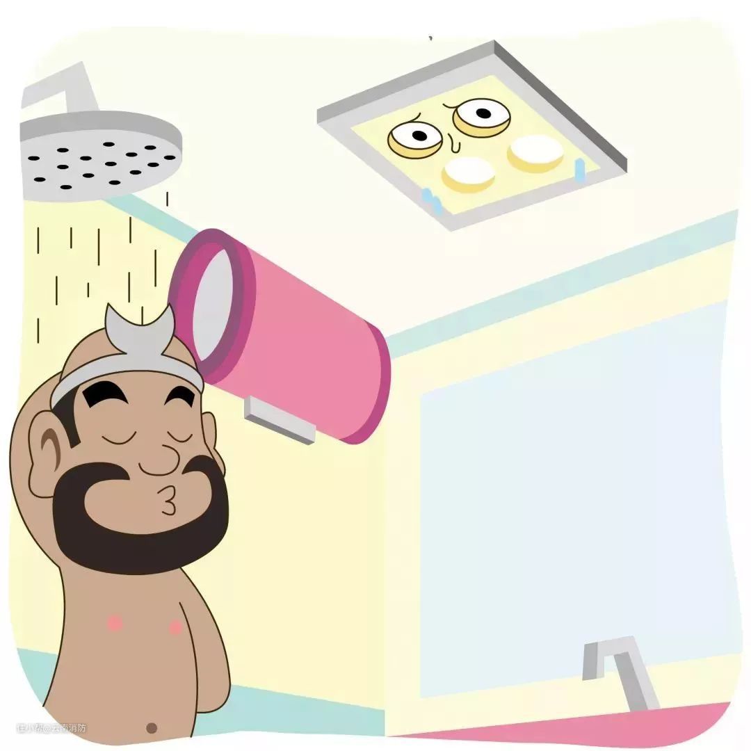 不能让浴霸长时间工作,以免造成电机短路; 也不能让水溅到电机上,尤其不要让沐浴液、 洗发水等泡沫溅到电机或其他电器元件上,以 防腐蚀损坏绝缘体,从而造成短路打火