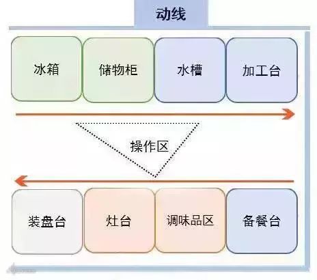 但是I型布局也存在一定弊端,就是只能按照固定的路线来进行操作,一旦流程错乱,按照洗-切-炒每个区域1米计算,至少都是3米以上往返的长途奔袭了。