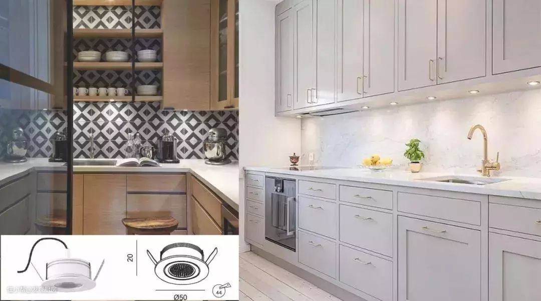在做橱柜时,往往忽略了操作台(切菜区域)的光照问题。因为有上方吊柜的遮挡,不少人只有在切菜的过程中,才会发现光线不明、昏暗模糊。可以在吊柜下方装上一根T5 LED灯管或者LED灯带,位置选择在柜子底部距离墙壁200-250mm的地方。记得加个小挡板之类的防止炫光的产生。如果厨房空间足够,还可以安装一些艺术灯创造雅致浪漫的氛围空间,显得厨房明朗又温馨,顿时做饭心情就上来了!