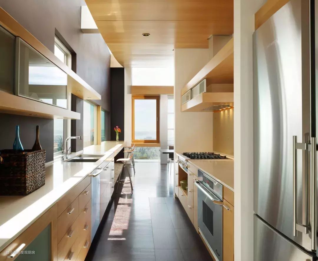 I型布局适用于长条状的厨房。将功能区按照使用逻辑一字排开,一条动线便可贯穿整个厨房,让做饭的过程中流畅感爆棚。