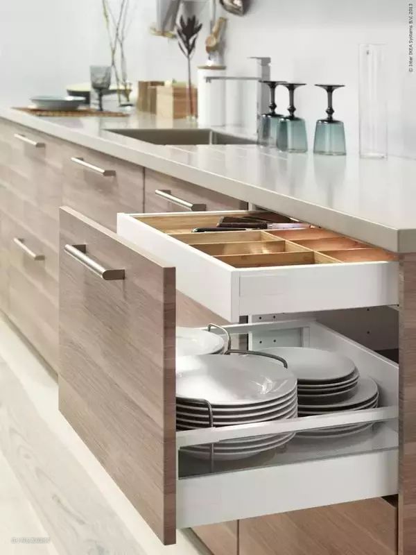在水槽和灶台之间,一般会留一定的空余准备间,用来放案板切菜、和面等。这部分区域的长度,如果小于300mm,那么只能放个盘子,基本没有切菜的空间。建议设计之初,将长度控制在600-800mm,足够放下案板的同时,也不至于因相距太远而显得整个橱柜台面失调。