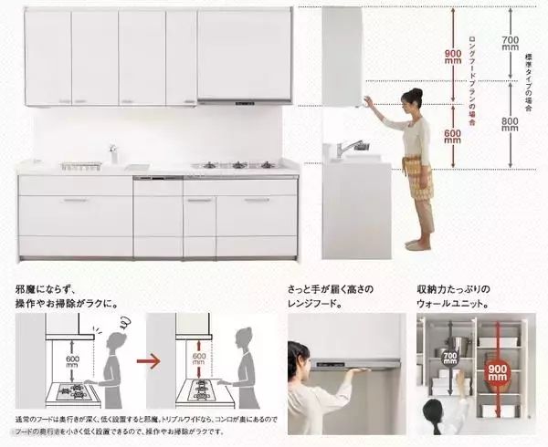 假设使用者身高在160cm左右,烹饪区台面高度却有90cm,台面太高,炒菜就耸肩,无形之中给人的身体增加了很多负荷。所以在灶台高度设计时要根据使用者的身高设置一个合适的尺寸,给烹饪区和清洁区台面做一个高低落差。一般烹饪区台面的高度普遍设计在80-85cm;那么清洁区台面部分就适当加高5cm。