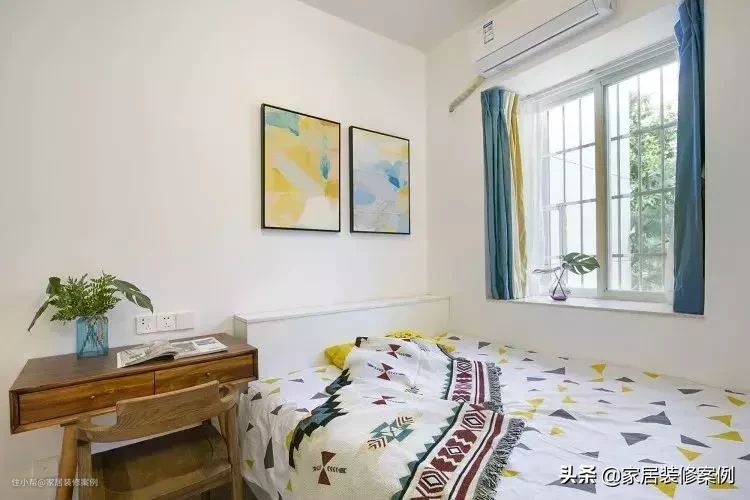 卧室墙面的挂画和床单色彩,简洁明快增添了活力感,床头摆放着一张小书桌,方便看书写字。